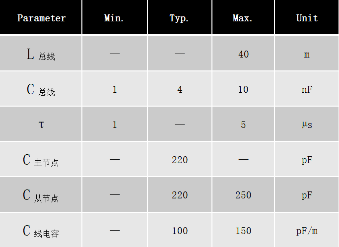 RC时间常数中R为总线上所有节点上拉电阻并联的总阻值R总线,C为总线上所有的主从节点并联电容及总的线电容之和即C总线 ,这个值限定在(1~10nF);如下: