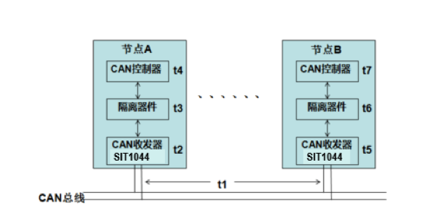 以节点A发送,节点B接收为例,从CAN报文发出开始,到接收到ACK应答,整个应答回路延时为T=(t1+t2+t3+t4+t5+t6+t7)*2,期间报文经过了4次隔离及收发器,两次线缆;