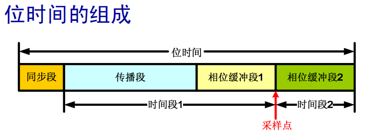 CAN总线通信中每一位的时间由4部分组成,即同步段、传播段、相位缓冲段1、相位缓冲段2,划分为3段。